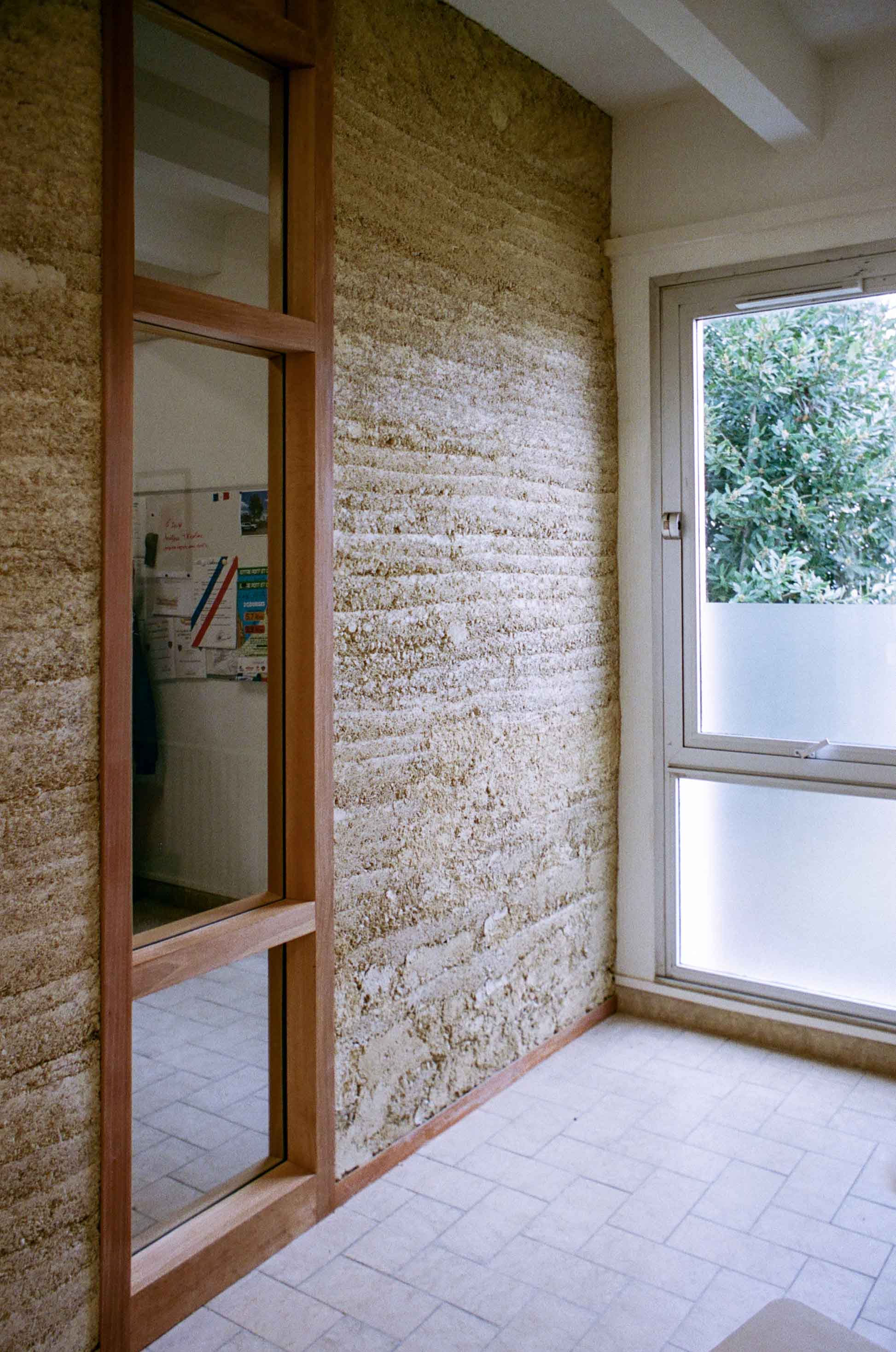 Le projet s'ancre fortement dans l'identité locale. La cloison en terre crue fait écho à l'histoire de Langeais, ancien territoire de production de briques réfractaires. Elle est réalisée à partir d'un mélange inspiré de torchis et du pisé, intégrant des fibres de paille de colza issues d'un coproduit agricole local, du sable de falun extrait d'une carrière voisine, et une terre fournie par le dernier fabricant local de terre cuite.