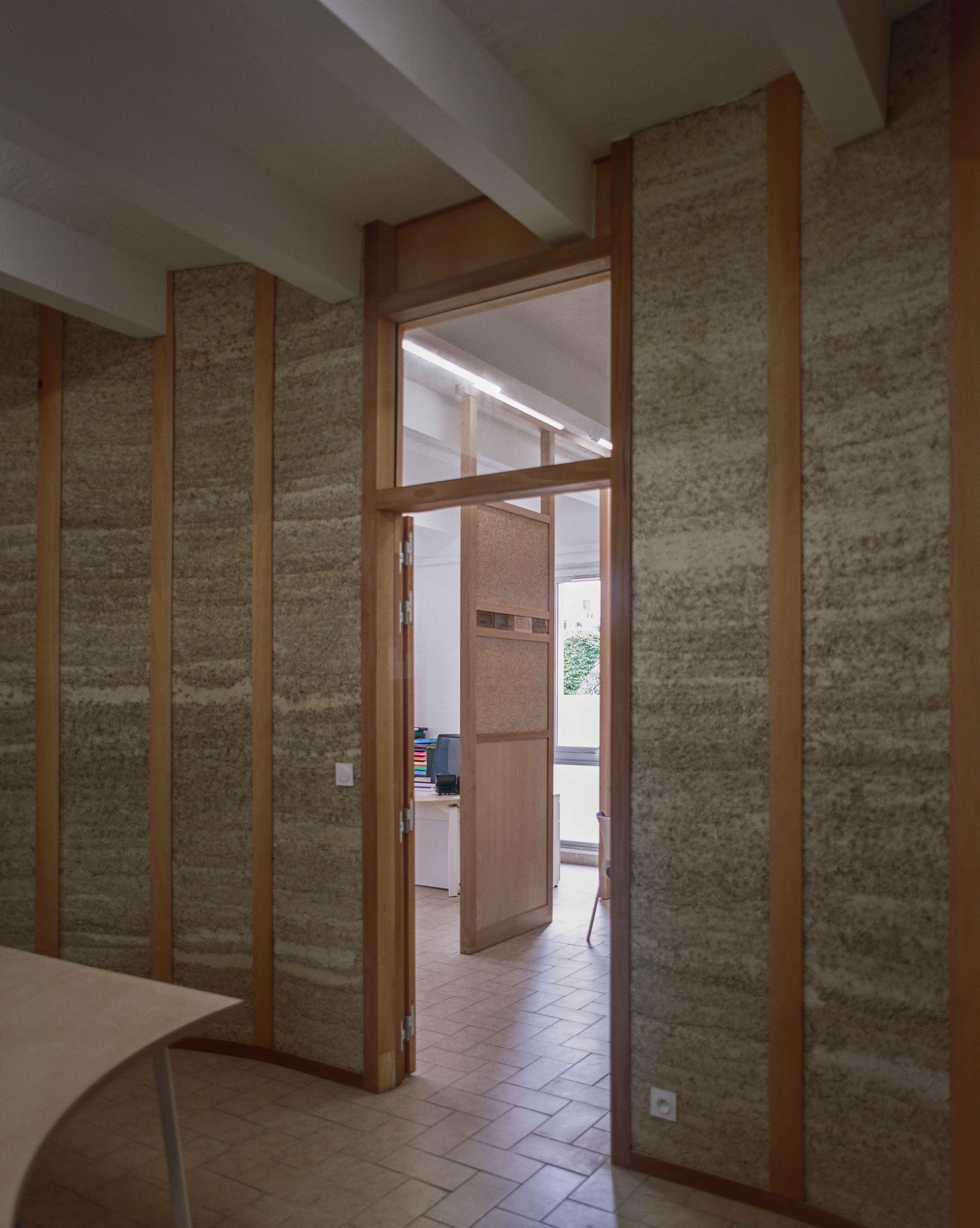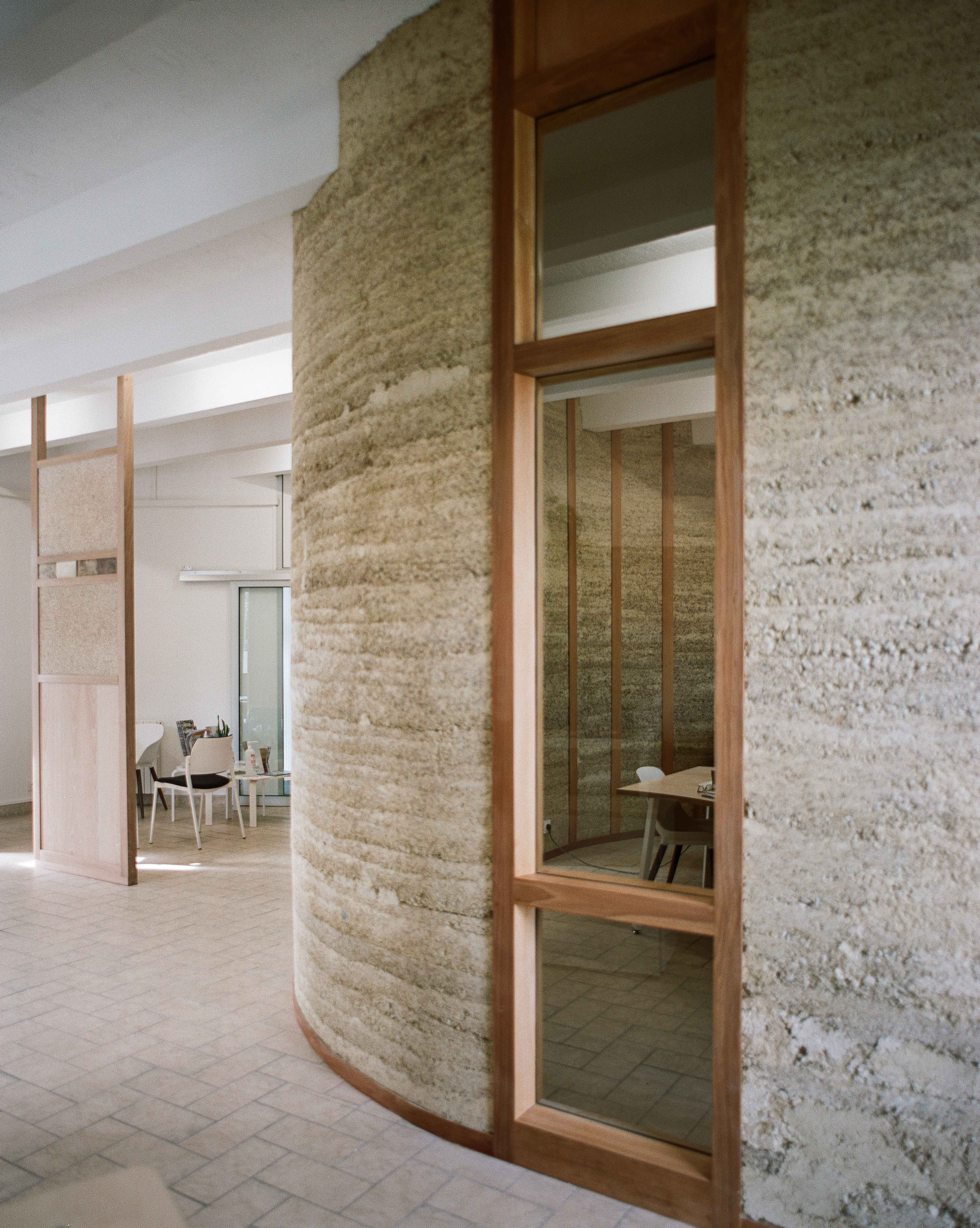 Ancien office de tourisme puis théâtre, ce bâtiment disposait d'un grand volume ouvert peu adapté aux besoins de confidentialité. Le projet répond à cette contrainte par la création d'une cellule intérieure en terre crue, aux formes arrondies, assurant à la fois séparation des usages et absorption acoustique, tout en structurant l'espace sans altérer l'existant.