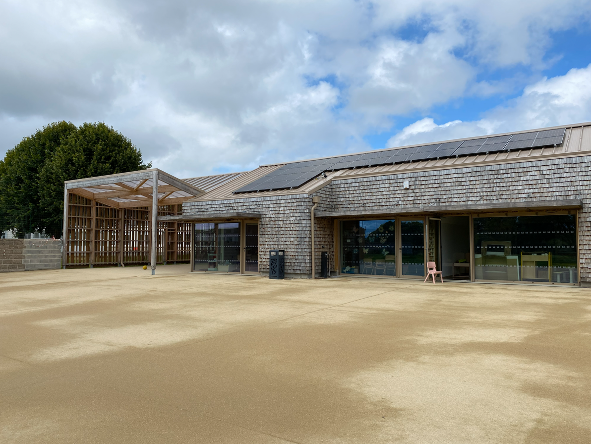 La construction neuve repose largement sur des matériaux biosourcés et locaux : ossature bois (épicéa, Douglas), bardeaux de châtaignier, brise-soleil en robinier et isolation en paille complétée par la laine de bois. Le projet mobilise 137 m² de bois provenant de forêts françaises. La conception privilégie le confort d'été grâce à des BSO orientables et fixes. Une installation photovoltaïque en toiture génère une part d'énergie renouvelable, tandis que le chauffage est assuré par une chaufferie gaz naturel.