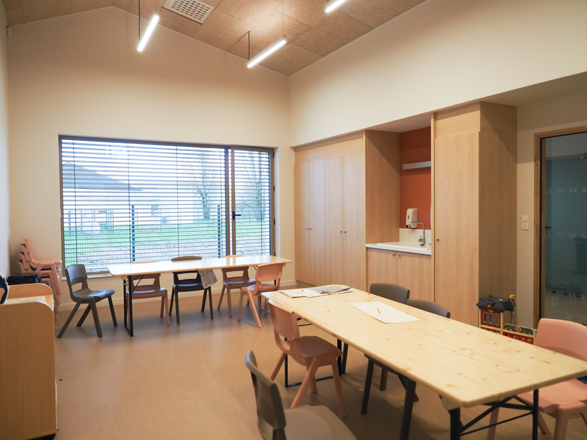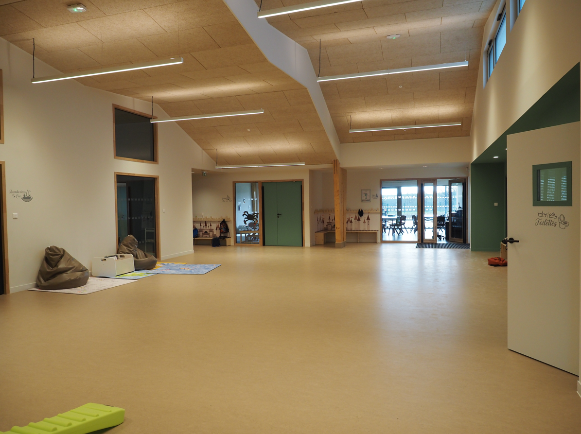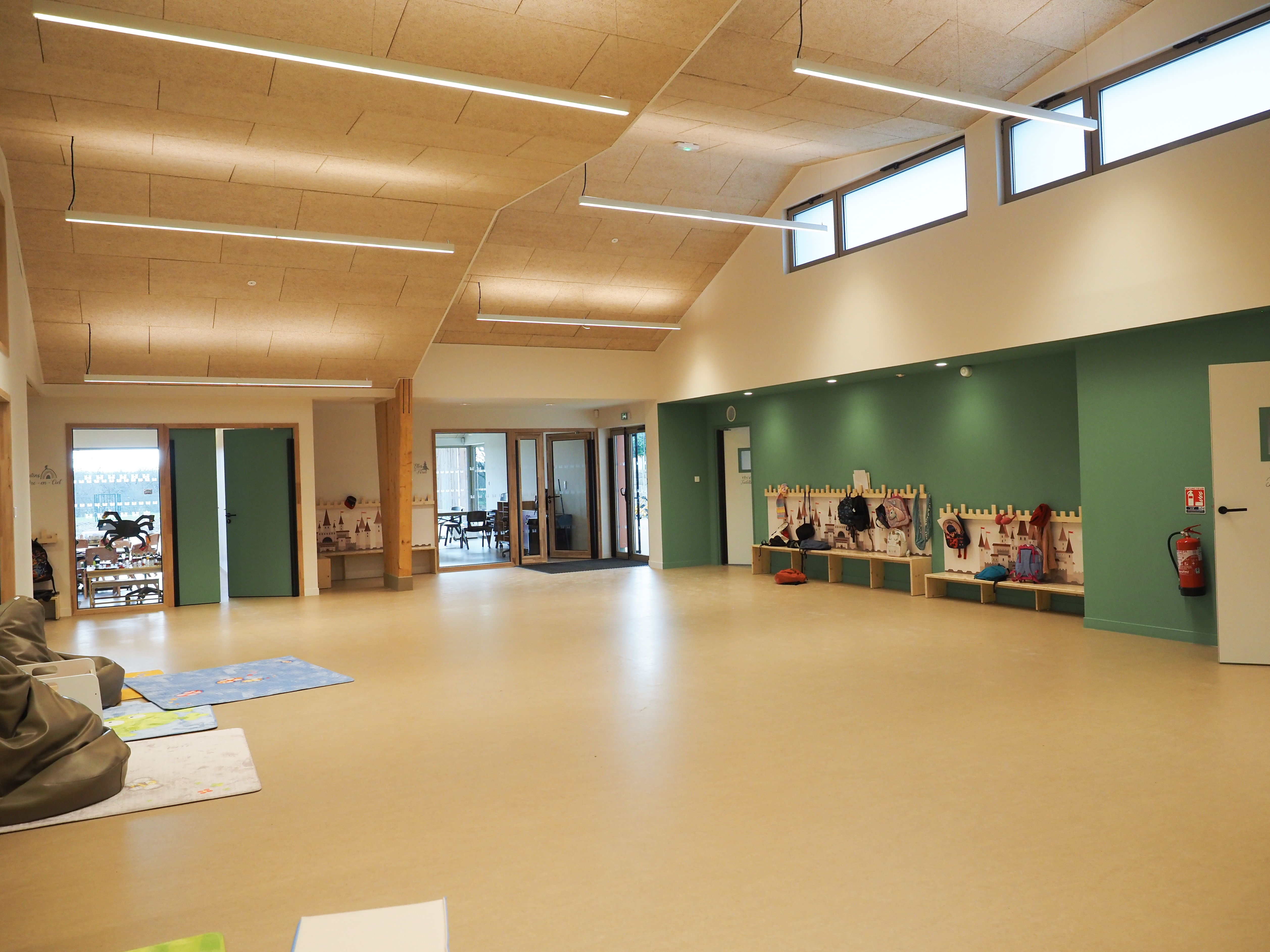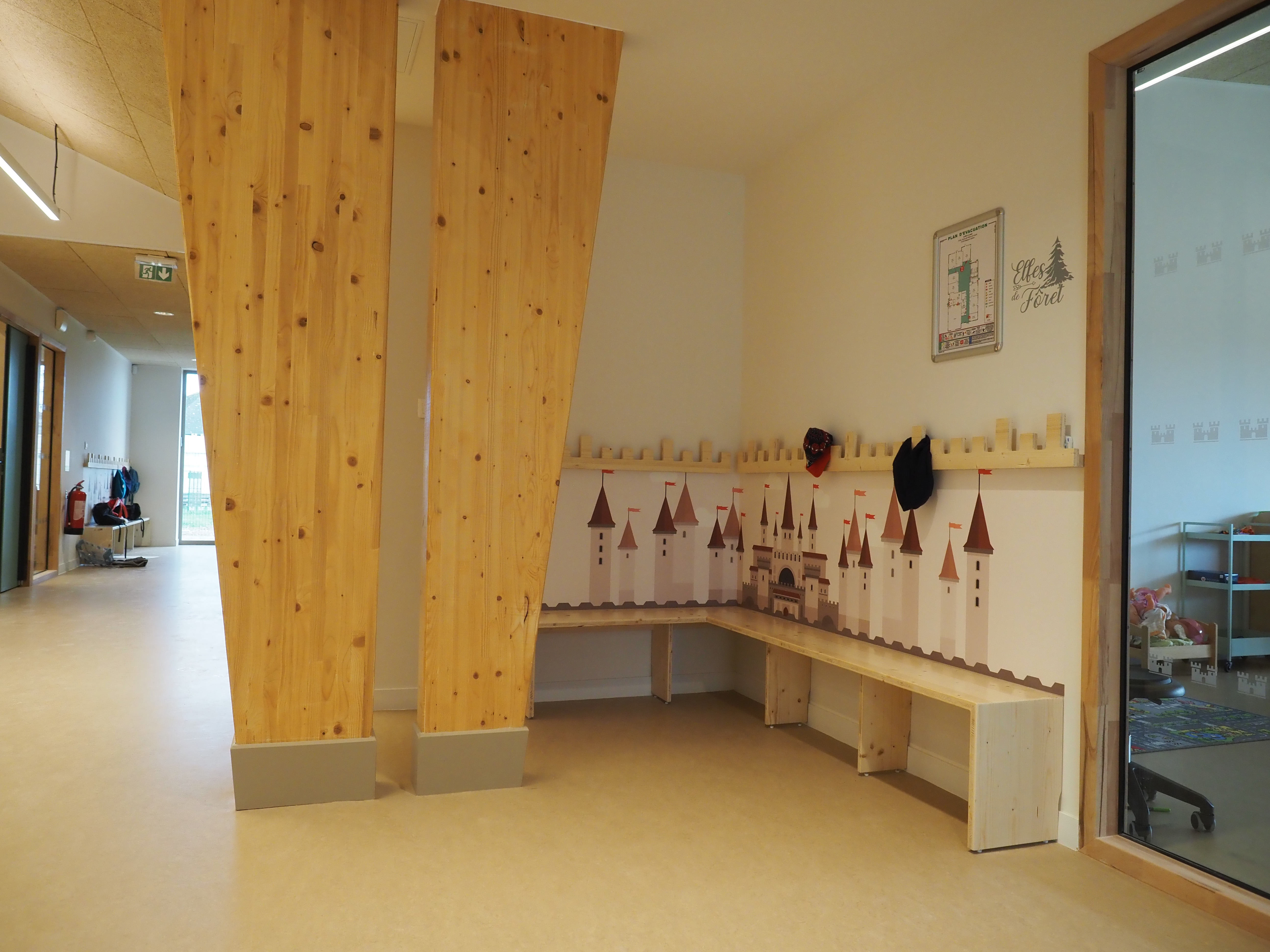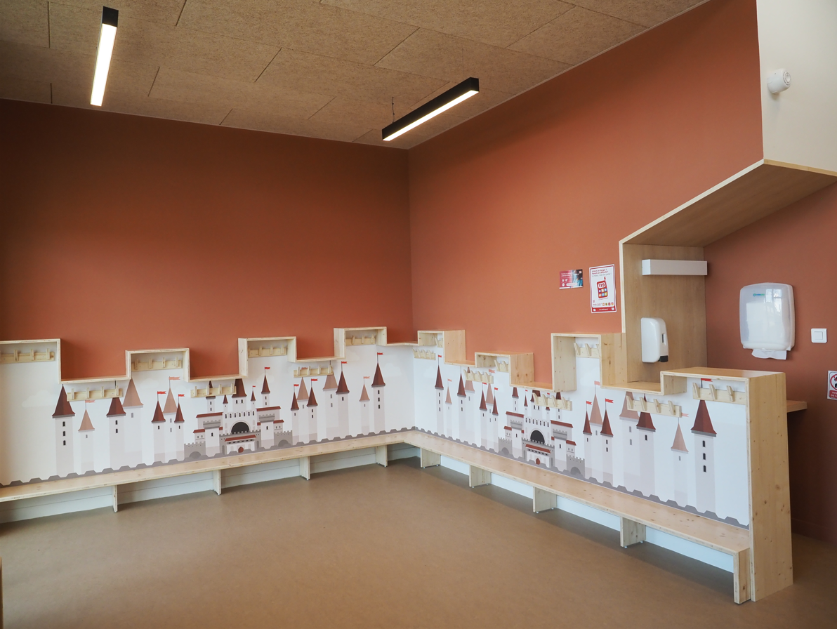 L'architecture s'inspire d'un imaginaire médiéval (pontons, motifs, crénelages) pour créer un univers d'accueil chaleureux pour les enfants. Une noue paysagère renforce la gestion douce des eaux pluviales et la biodiversité.